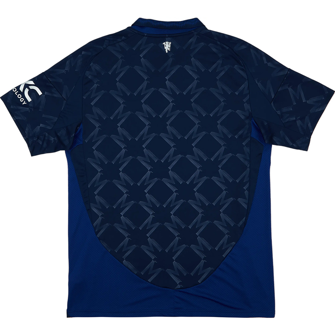The new Manchester United FC 24-25 away football jersey features a navy blue main color ("Night Indigo") combined with light silver logos and red accents.